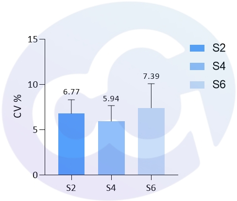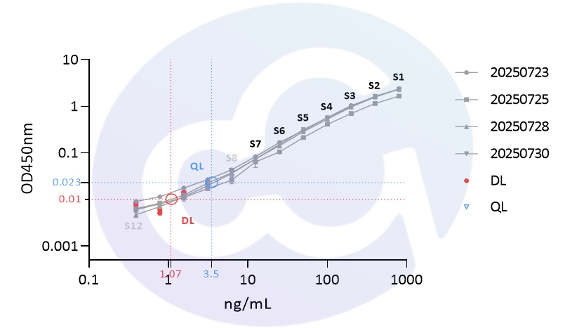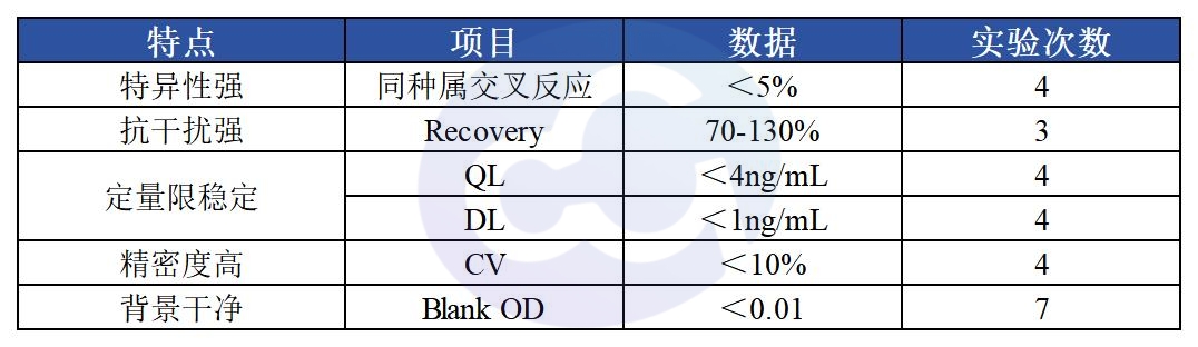 同时,汇总多批次实验,确定汉逊酵母HCP的线性范围,R²,质控参数,包括QL、DL、Recovery、CV等,见下表2-6、图2-5。主要特点包括但不限于特异性强、抗干扰强、定量限稳定、精密度高、背景干净。