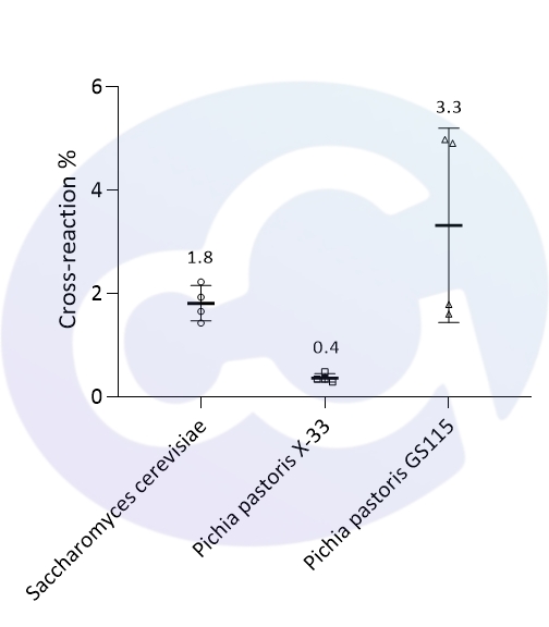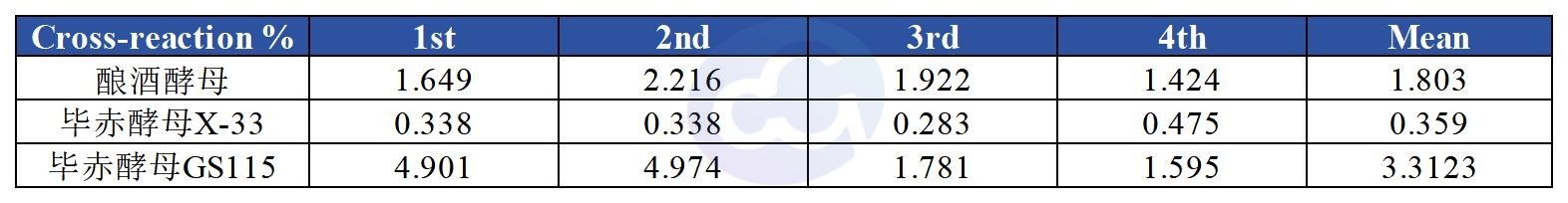 由于汉逊酵母与酿酒酵母,以及毕赤酵母都有很近的亲缘关系。所以,我们测试了汉逊酵母HCP Kit对酿酒酵母和毕赤酵母(X-SS,GS115)HCP的交叉反应,结果显示,汉逊酵母HCP Kit对后两者的交叉反应均小于3.3%,介于0.4%-3.3%之间。且本底控制效果优异,详见《本底“瘦身”计划:HCP ELISA开发记》。